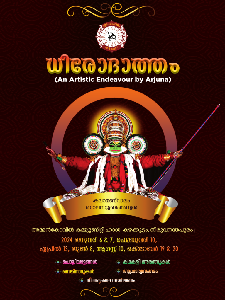 ജനുവരി 6, ജനുവരി 7 , ഫെബ്രുവരി 10 , ഏപ്രിൽ 13 , ജൂൺ 8 , ഓഗസ്റ്റ് 10 , ഒക്ടോബർ 19 , ഒക്ടോബര് 20 എന്നീ ദിവസങ്ങളായാണ് തിരുവനന്തപുരം കഴക്കൂട്ടം അമ്മൻ കോവിൽ ഹാളിൽ വെച്ച് “ധീരോദാത്തം ” എന്ന് പേരിട്ടിരിക്കുന്ന ഈ പരിപാടി നടക്കുക .